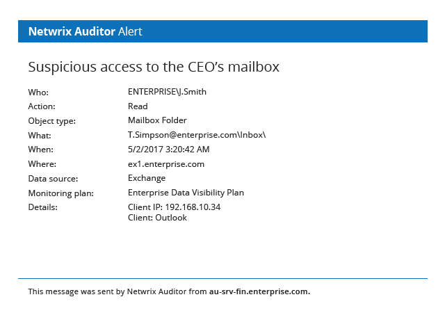Netwrix Auditor for Exchange simplifies Microsoft Exchange Server auditing. Monitor non-owner mailbox access events and track changes made to Exchange server configuration and permissions to prevent data breaches, prove IT compliance and ensure ongoing availability of email services.