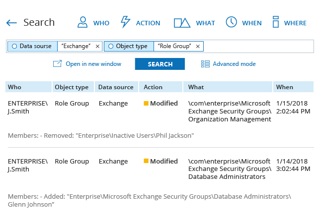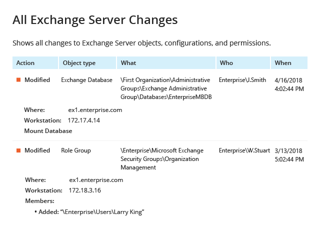 Simplifies Microsoft Exchange auditing by delivering detailed information about all changes, including when each change occurred, who made it, what exactly was changed, and the current and past values.