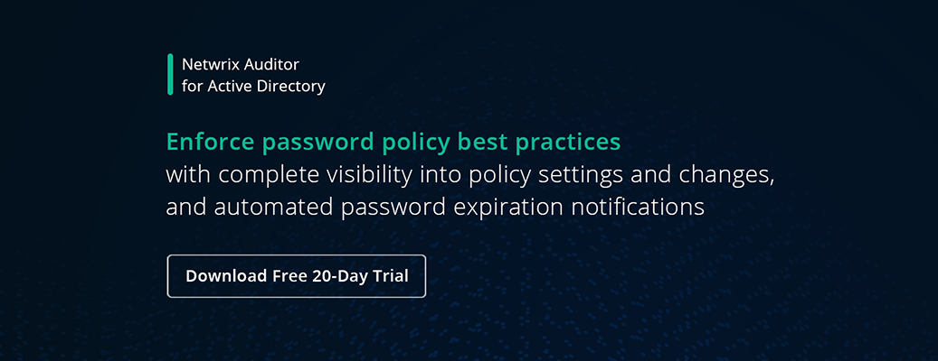 Planning is critical to the password auditing process. Administrators must be selective about which objects to audit because auditing creates system overhead; auditing too many objects in AD will cause the security log to become large and reduce audit capabilities by overwriting itself. In addition, rather than editing the default domain policy, create one or more new policies and attach them to the specific organizational units (OUs) that you need to audit. For additional important tips on password policy GPO auditing, see our Active Directory Group Policy Auditing Quick Reference Guide. Events related to Windows server password policy are recorded in the security event log on your default domain controller. By reviewing these logs with the help of Windows Event Viewer, IT administrators can determine who made changes to password policy settings in a Windows Server domain, and when and where (on what domain controller) each change happened. However, native auditing tools don’t show critical details, such as the name of the Group Policy password policy that was changed and the type of action that was performed. To perform domain policy management faster and easier, you need additional software that provides more insight into password policy modifications, such as Netwrix Auditor for Active Directory.