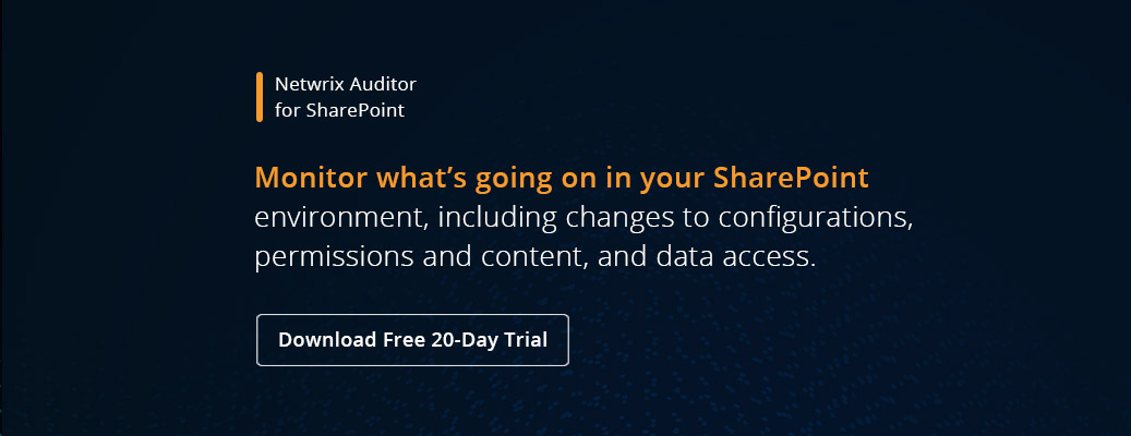 Every change to the configuration of your SharePoint farm should be documented and logged, and it is recommended to log all content changes as well. In order to configure content auditing in a SharePoint site, refer to our SharePoint auditing how-to’s and SharePoint Auditing Quick Reference Guide.
